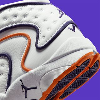 Arriving in a crisp white leather construct, the pair relies solely upon its piping and brand marks for character. Here, it’s deep purple and burnt orange that surround the pair, resulting in a scheme closely aligned to retro Phoenix home court kits.