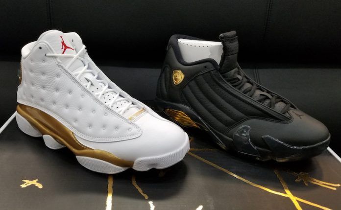 The pack consists of an Air Jordan 13 that features a White and Metallic Gold upper with red accents. The hologram has been changed from the traditional 23 to reflect the year ’98″. The second shoe, the Air Jordan 14 has a buttery-soft Black leather upper with Metallic Gold and Red accents. The Red, Black and Red colors of course represent the infamous Bulls colorway, with the Gold representing the NBA Championship Trophy.