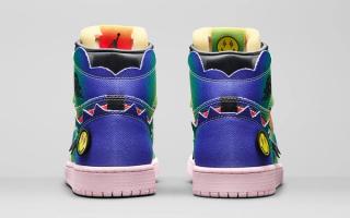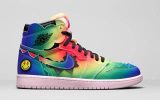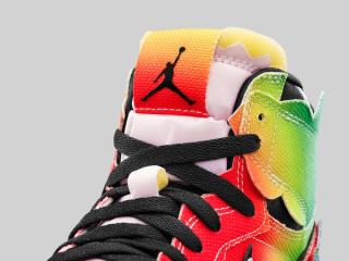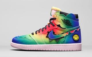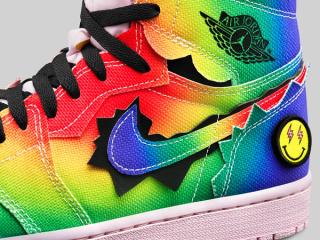 The J Balvin x Air Jordan 1 bold rainbow canvas upper has jagged-edge trimming and rounded-color wings that are meant to represent a cloud-like explosion — symbolizing Balvin’s source of energy. The artist’s smiley-face logo replaces the Jumpman logo on the left foot tongue tag, while pink, white and black laces and interchangeable patches (think a smiley face, a Jumpman, a basketball, and lightning bolt) enable wearers to customize the shoe based on their mood and creative expression.