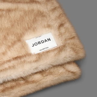 Rendered in a warm tan tone, the faux fur blanket embodies Jordan’s approach to modern luxury — understated yet elevated. A stitched white tag near the corner reads “Jordan – Holiday 2025” and “Est. 1984,” grounding the piece in the brand’s legacy while signaling its continued expansion into lifestyle territory.
