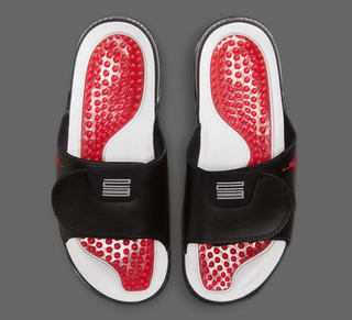 Developed for recovery and leisure, the Jordan Hydro has previously commemorated other popular looks from His Airness' signature sneaker series. The Air Jordan 5 "Grape" lent the slip-on model's its beloved "White/New Emerald/Grape Ice/Black" color scheme earlier in the year. The impending style borrows the Chicago Bulls-appropriate seen on Tinker Hatfield's patent leather-donning design from decades ago.