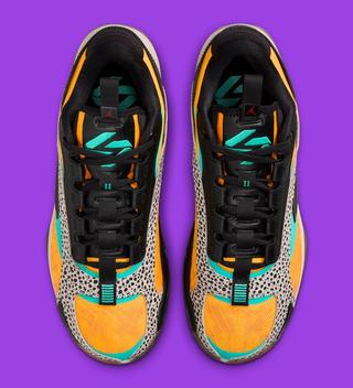 But the “Safari” theme isn’t the only star of the show. The sneaker surprises with bursts of color: the engineered mesh upper is accentuated with reinforced TPU panels in a vivid turquoise, a nod to both style and functionality. This is artfully paired with “Total Orange” elements that create a visual pop, reminiscent of a basketball's fiery passage through the net.