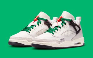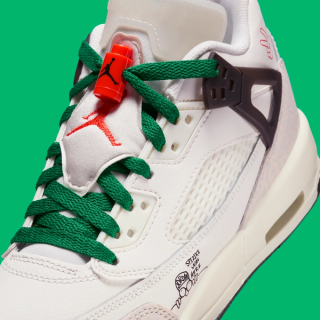 This model features a clean all-white upper trimmed with bold black rubber tread and winged eyestays, complemented by vibrant green laces and striking red embroidery on the tongue and lace locks. What truly sets this pair apart is Spike Lee's playful touch—illustrated hands adorn the collar, and a fun "Spizike Was Here" graphic is prominently displayed at the forefoot, adding a unique flair that celebrates the Brooklyn native's artistic spirit.