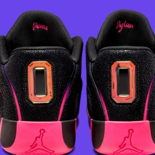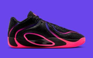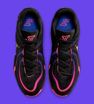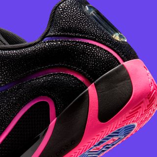 Dressed in a black, Fierce Purple, Racer Blue, and Hyper Pink color scheme, the Jordan Tatum 4 immediately stands out thanks to its shimmering, pebble-textured upper. The material choice adds depth and visual movement, catching light from every angle and giving the silhouette a slightly elevated, almost iridescent feel. Electric pink piping traces the shoe’s sculpted lines, while accents of purple and blue balance the otherwise dark base.
