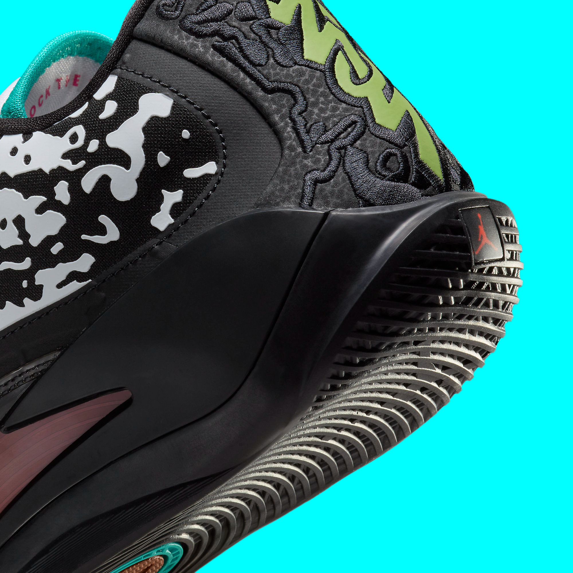 The Jordan 3 Zion "Shock The World" is designed to stand out, both in performance and style. The sneaker boasts a striking design with a black midsole that grounds the shoe, while the body is adorned with white and black splattered details that evoke a sense of motion and intensity, mirroring Zion's explosive playstyle. This artistic splatter pattern not only adds a layer of visual appeal but also signifies the disruptive force Zion brings to the game.