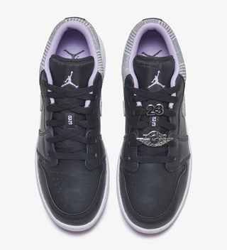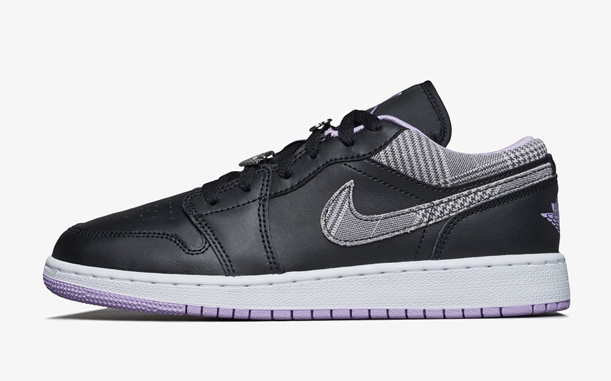 Like the accompanying pairs from the set, this too features an overarching color scheme of white, black, and lilac against the titular tweed weave. Once again it appears in greyscale, though here it’s utilized exclusively at the collar and Swoosh overlays. It’s heavy on blacks, with supple uppers, nylon tongues, and laces all donning the dark hue, before select pops of lilac at the tongue branding, liners, and outsoles liven up the aesthetic. Between the latter and the upper is a bright white midsole before adding in select Jordan-branded lace bling to complete the design.