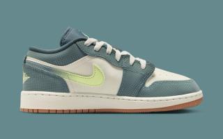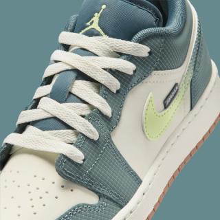 The Air Jordan 1 Low “We Outside” arrives with a ripstop-inspired upper, pairing muted teal overlays with a sail leather base for a look that feels both rugged and approachable. Textured paneling reinforces high-wear areas, while contrast stitching adds subtle depth across the build. A pale green Swoosh brings a pop of color to the sidewalls, complemented by tonal Jumpman branding at the tongue.