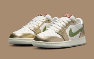 The sneaker is a visual feast, boasting metallic gold overlays on the mudguard, eyestays, and heel. These shimmering touches add a sense of luxury and infuse the shoe with festive vibes, resonating with the Lunar New Year's celebratory atmosphere. Complementing these opulent details uses sail leather on the toe and midfoot, striking a balance between richness and classic sneaker aesthetics.