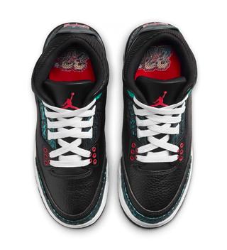 The Air Jordan 3 "Moto" has an all-black upper that is the perfect backdrop for vibrant color accents, mimicking the adrenaline-pumping world of racing. The iconic elephant print at the toe-guard and heel is infused with a striking Hyper Jade teal, creating a vivid contrast that will catch the eye. Adding to the racing vibe, Siren Red highlights the branding on the tongue and adds dynamic pops of color to the outsole's traction pods.