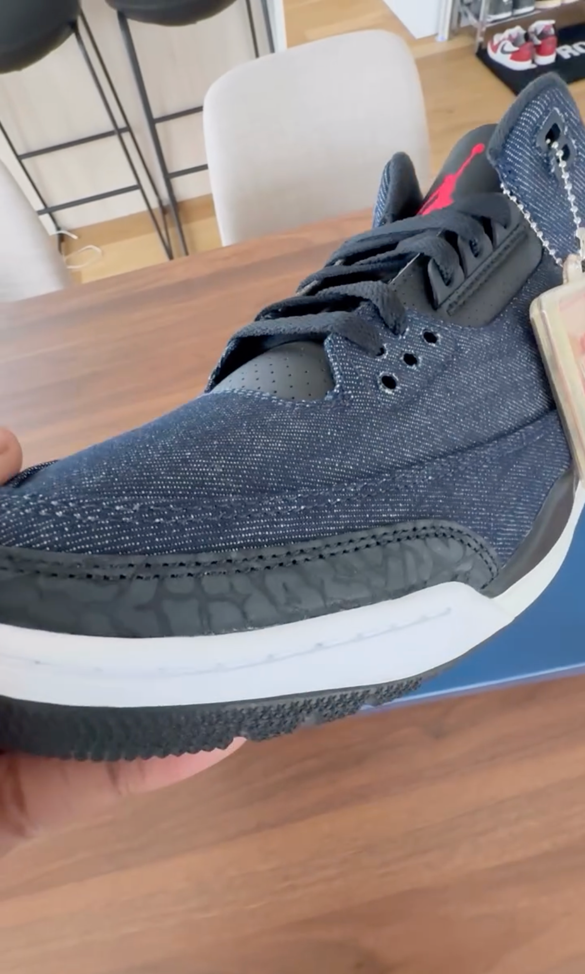 This marks the first public sighting of the partnership ahead of its official reveal next year. The pair worn by the Knicks superfan features a dark indigo denim upper, complemented by black elephant print overlays and white midsoles. Red accents appear on the lace eyelets and tongue tag, adding a subtle pop to the classic construction.