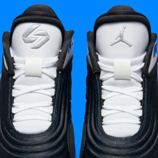 The shoe's black frontal body is accented with a topographical design, featuring dimmed blue levels that evoke the color palette of the Dallas Mavericks. The deep blue shades seamlessly transition into the white paneling toward the heel, offering a clean and sleek contrast. On the heel, the iconic Jordan Jumpman logo makes an appearance, reinforcing the connection to the Jordan brand and its continued influence on the Luka line.