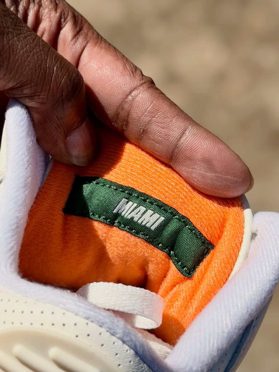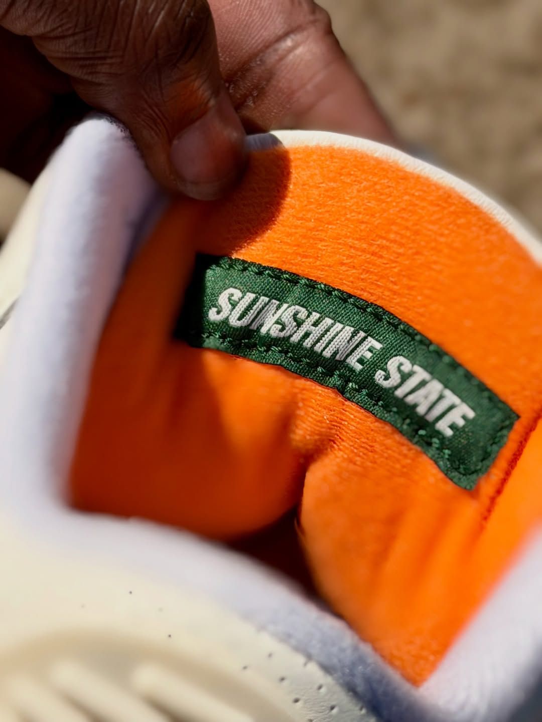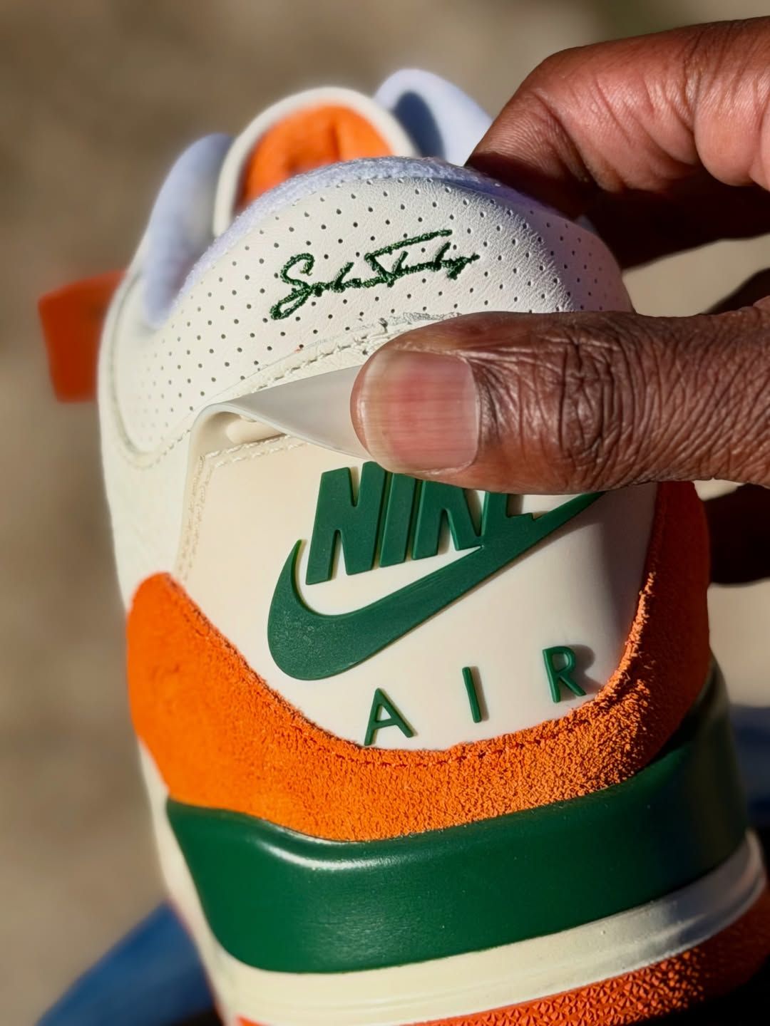 Co-owners of SoleFly and former NFL star Edgerrin James were spotted wearing the pair on the field, giving us the first real look at the collaboration. The sneaker arrives in a Hurricanes-inspired mix of Sail, Gorge Green, and Bright Mandarin, highlighted with classic color-blocking and premium suede overlays. It’s a theme SoleFly has touched on before with its duo of Air Jordan 1 releases in 2018, but this marks the first time the storied partnership has used the Jordan 3 silhouette to celebrate the U’s colors.