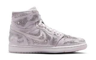Official Nike.com imagery also confirms premium packaging. The pair arrives in black satin dust bags and a matte-black box, reinforcing its high-end presentation. Most notably, the collection includes a crystal-covered bracelet finished with a Jumpman charm — a first for a Jordan 1 collaboration of this scale and a clear extension into jewelry-inspired styling.