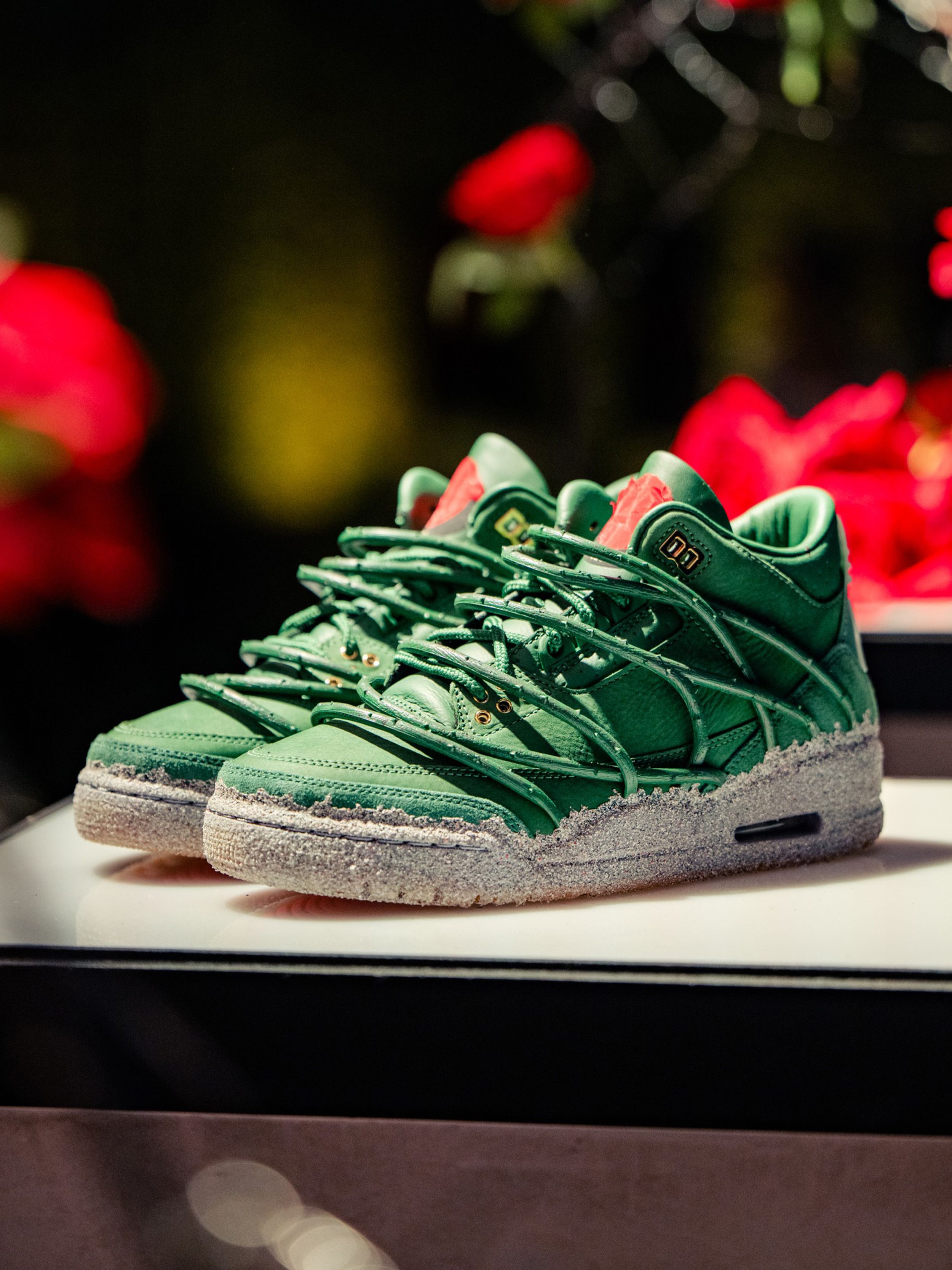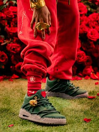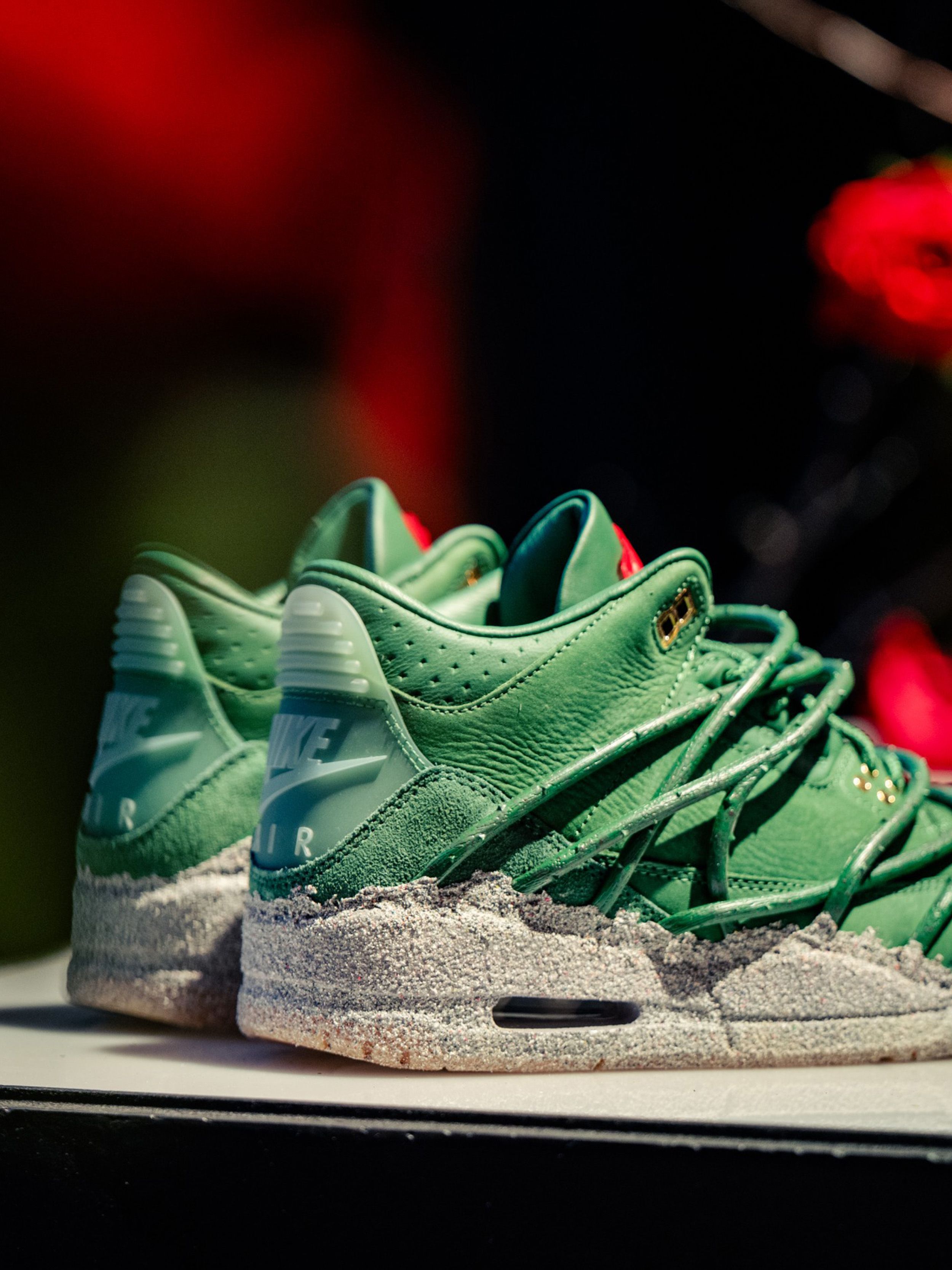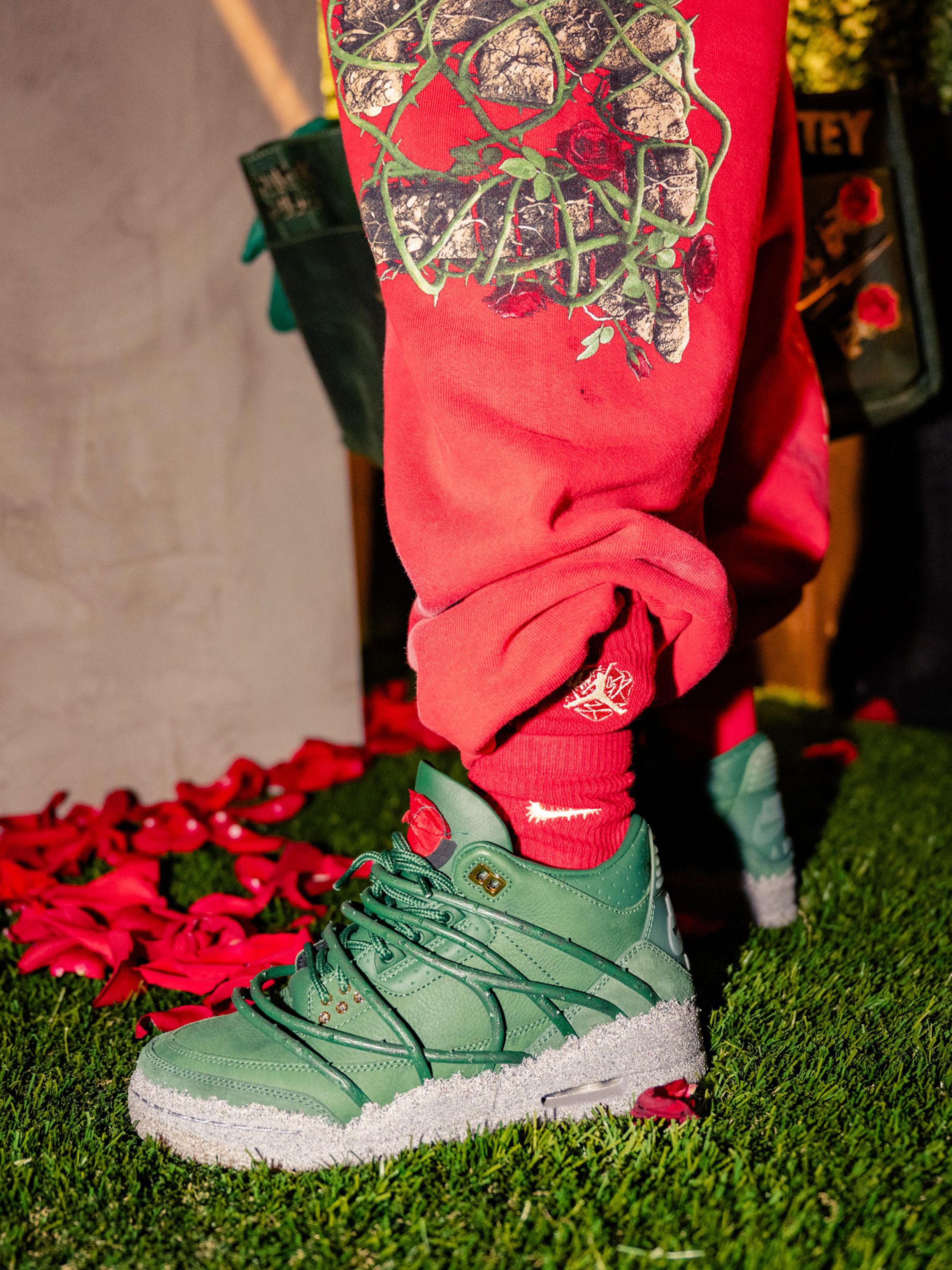 The sneaker features a muted green leather upper, grounded and understated. Beneath it sits a rough, concrete-inspired midsole finish that contrasts with the smoother leather panels above, reinforcing the metaphor of growth through pressure. On-foot imagery from the LA activation highlights how the green tones pair with red styling and floral staging, subtly reinforcing the rose motif without overwhelming the classic Air Jordan 3 structure.