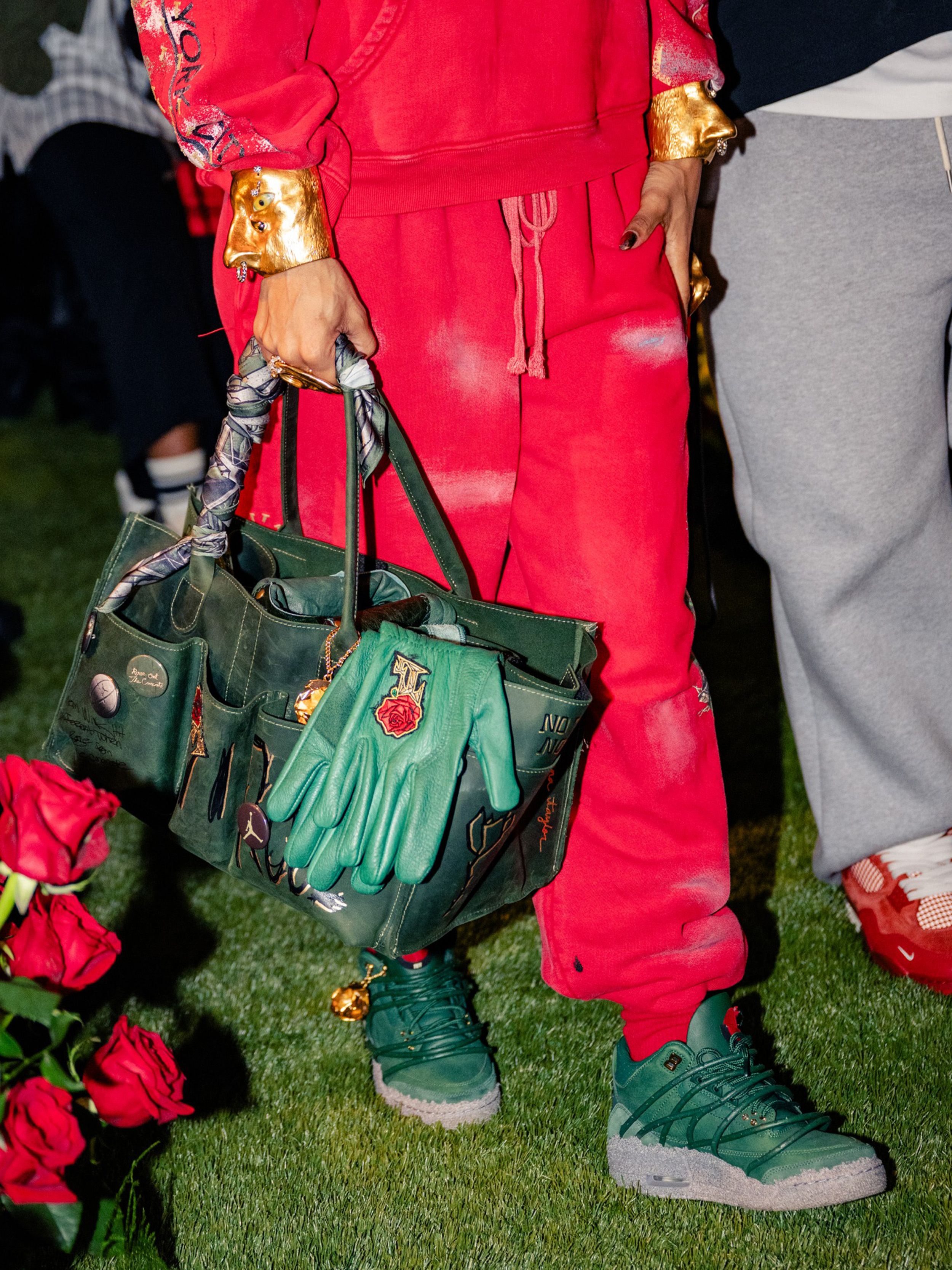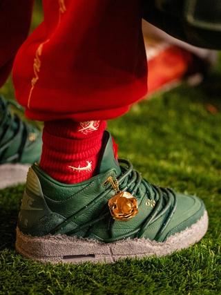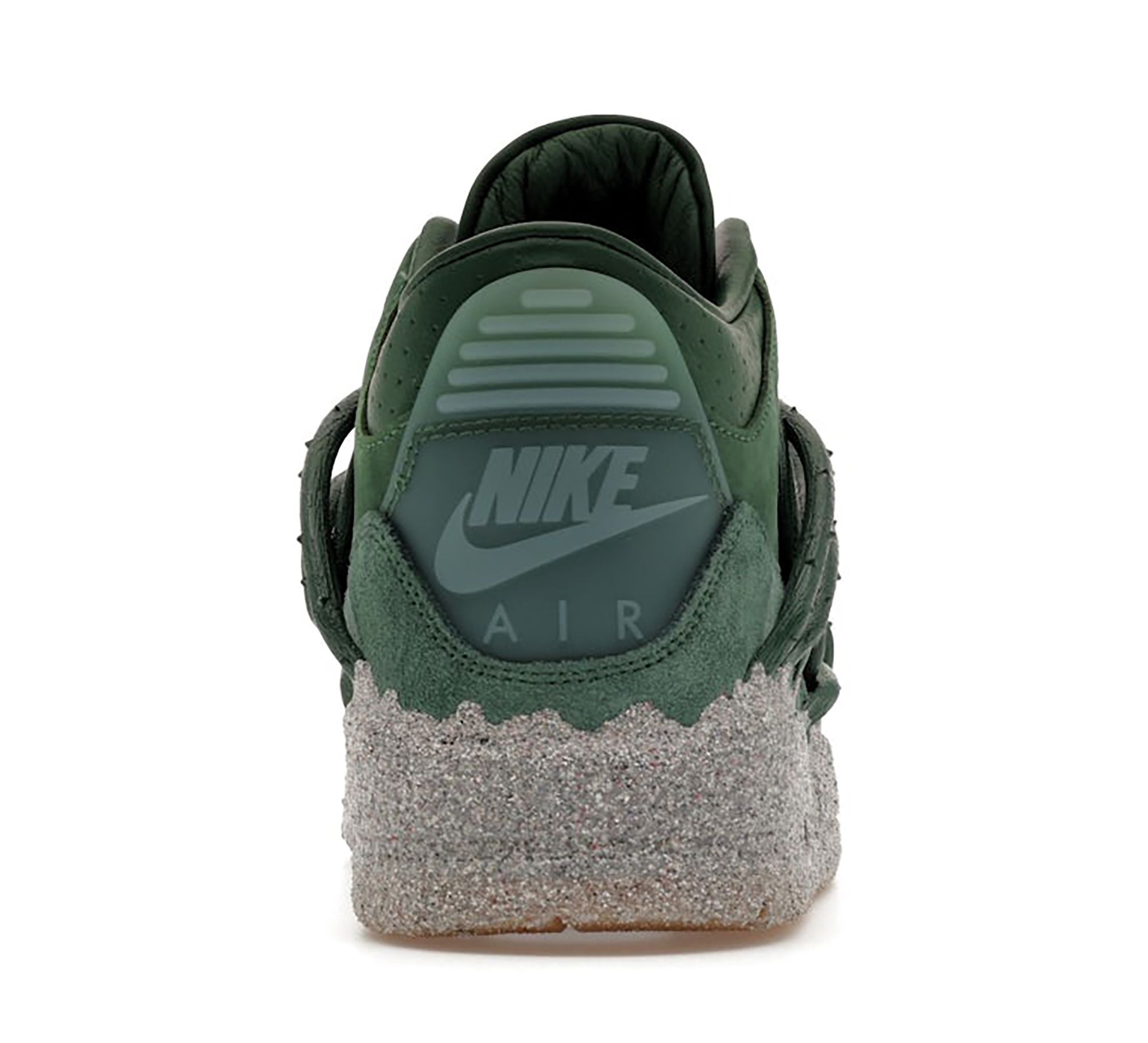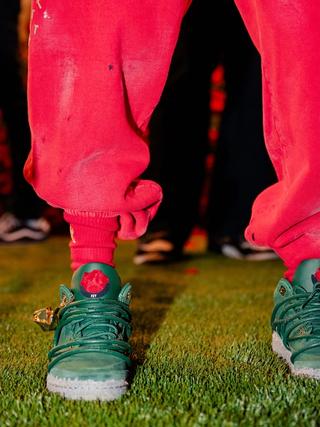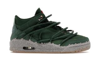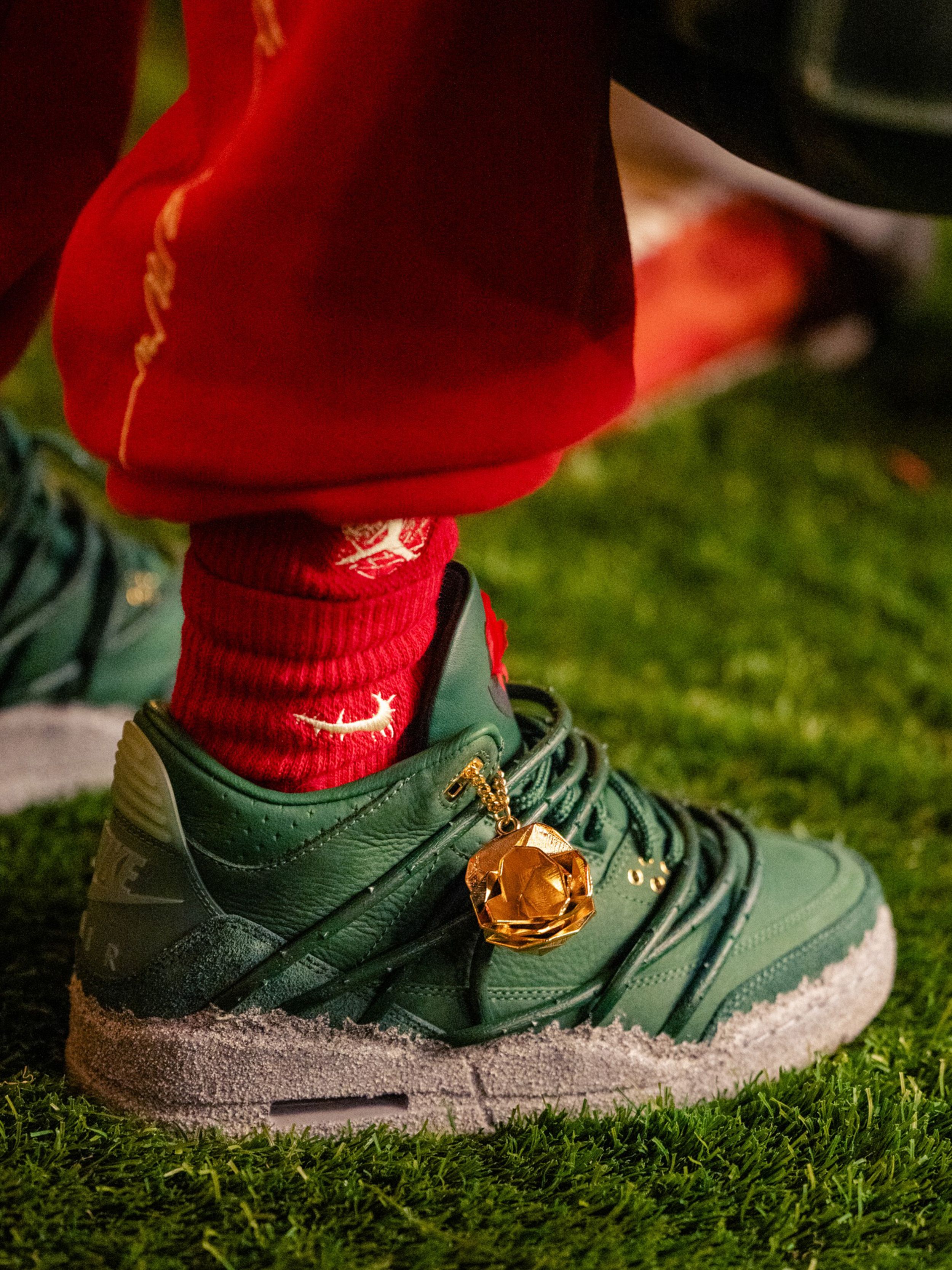 The sneaker features a muted green leather upper, grounded and understated. Beneath it sits a rough, concrete-inspired midsole finish that contrasts with the smoother leather panels above, reinforcing the metaphor of growth through pressure. On-foot imagery from the LA activation highlights how the green tones pair with red styling and floral staging, subtly reinforcing the rose motif without overwhelming the classic Air Jordan 3 structure.