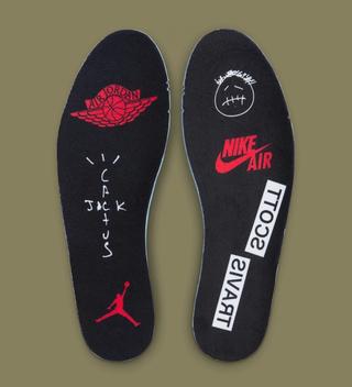 Set in a "Medium Olive/Black/Sail/Muslin" color scheme, the sneaker echos the design language of Scott's previous endeavors with the Jordan 1 Low, namely the "Reverse Mocha" release, where uppers of olive suede host overlays of white leather; Here, though, Swooshes are set in bold black.
