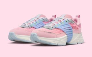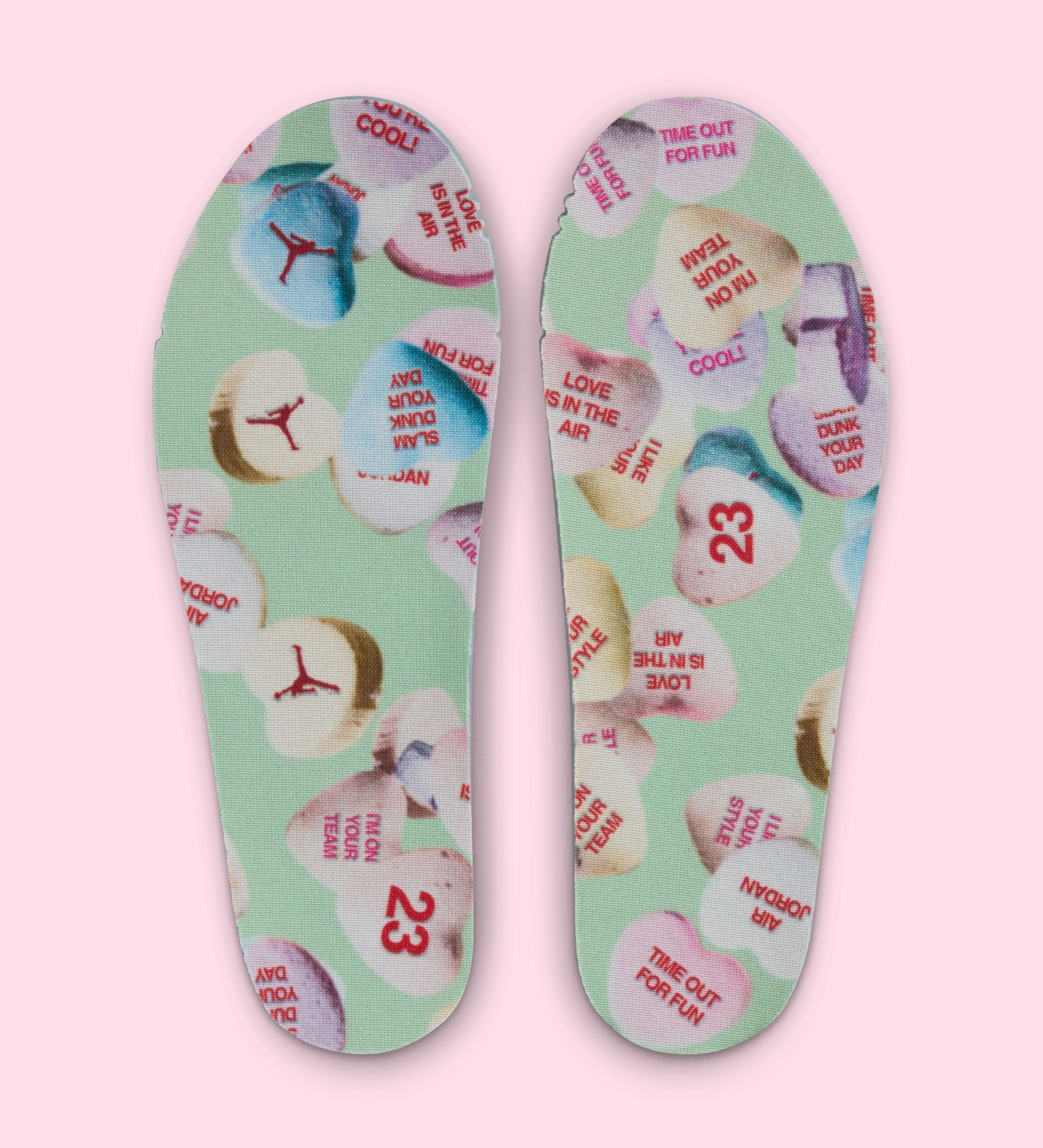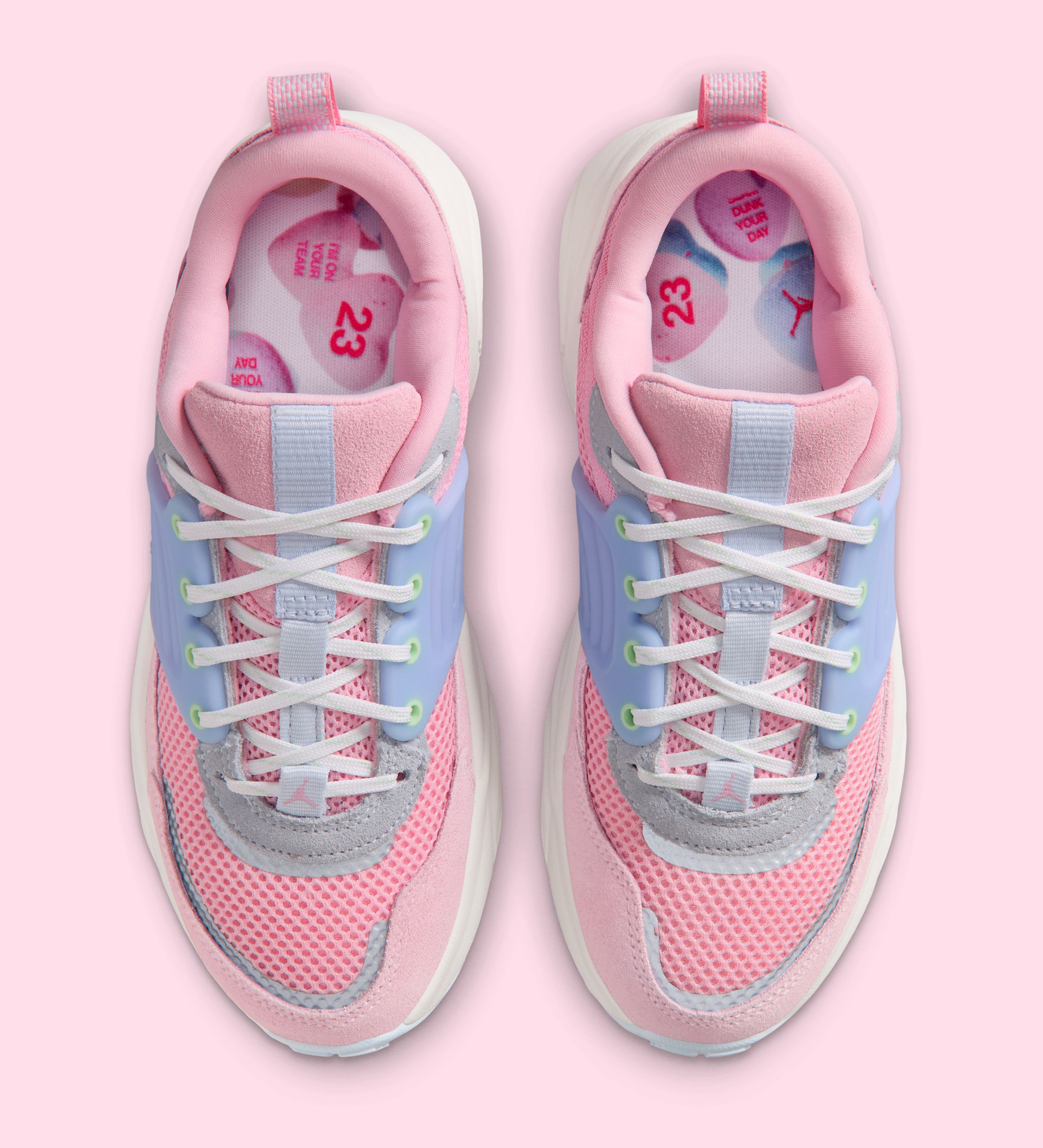 For Valentine’s Day, the Trunner O/S adopts a pastel-heavy palette inspired by classic candy hearts. Pink mesh uppers are paired with powder-blue cage elements, mint-green lace eyelets, and light-grey suede accents. The theme extends beyond the box, with heart-shaped candy graphics lining the packaging and insoles, complemented by playful phrases like “Love Is in the Air” and “Time Out for Fun,” reinforcing the holiday theme without feeling forced.