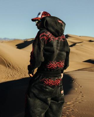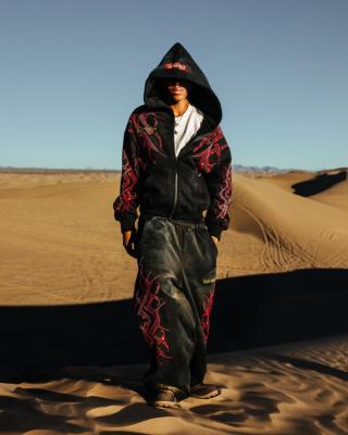 The limited collection debuted exclusively at the event, featuring standout pieces like rhinestone-embellished hoodies, oversized denim, flame-detailed track sets, and graphic tees adorned with Yu-Gi-Oh! icons such as “Pot of Greed.” Every design carried Loiter’s signature balance of vintage-inspired edge and anime reverence.