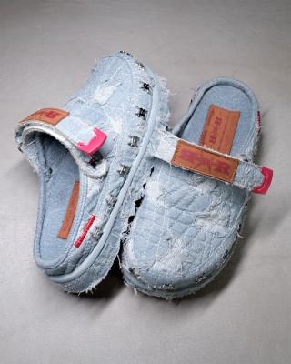 Inspired by traditional Japanese boro denim craftsmanship, REDRUM takes this beloved textile and injects a touch of Americana, creating a piece that speaks to heritage and modern streetwear sensibilities. The mules feature striking red and tan leather accents reminiscent of classic heritage denim jeans. Western-style chrome "R" spurs on the sweeping lockdown strap add a unique flair to the design, elevating this slip-on shoe to an authentic East-West influence.