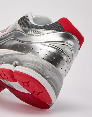 The sneakers' uppers combine soft leather and sport mesh with metallic finishes that enhance their modern, techy vibe, making them perfect for the season. These shiny materials are complemented by striking red accents, reflecting the festive energy of Christmas lights and other holiday decor. The bold red hues pop against the metallic backdrop, further amplifying the seasonal vibe.