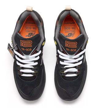 The New Balance Tiago Lemos 808 skate shoe is a masterpiece of thematic design, featuring orange and yellow accents that mimic the 808's iconic buttons. The typography on the heel reads "Rhythm Composer" and the Roland logo on the tongue nod to the original instrument's design, while the insoles brandish a co-branded New Balance x Roland graphic in vibrant orange. The shoe incorporates unique design elements like a rubber hangtag shaped like the TR-808, with additional detailing on the upper eyestays and heel logos in yellow to highlight the thematic color scheme. The rest of the shoe is draped in black, allowing these intricate details to stand out dramatically.