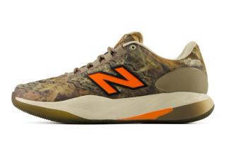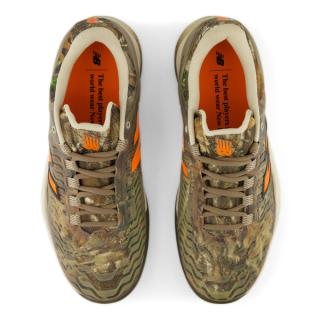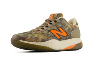 Contrasting the subdued base is a Blaze Orange New Balance “N” logo, providing a clear visual hit against the camo upper. The combination keeps the look grounded in outdoor themes while maintaining visibility on court.