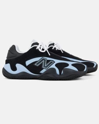 As shown, the New Balance Maxey v1 features a low-cut build with a streamlined shape, designed for speed and movement. The upper is predominantly black, constructed with mesh and synthetic materials, while blue overlays flow across the sides and wrap into the midsole, creating a fluid, almost sculpted appearance. A prominent “N” logo sits at the midfoot, outlined to stand out against the darker base.