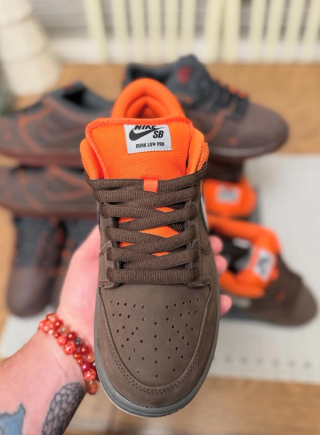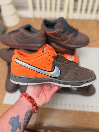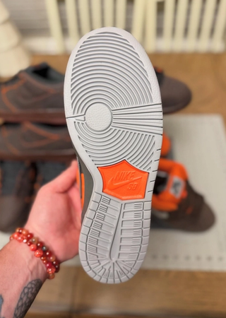 Uppers feature a blend of bold and subtle panels across two pairs. "Lightening/Wolf Grey" and "Safety Orange/Baroque Brown" suede panels are split at the mid-foot, delivering one of Nike SB’s more playful and irregular design treatments. Swoosh overlays are rendered in reflective grey with black outlining, a design detail that adds to the layered aesthetic. Underfoot, a dual-toned midsole and outsole continue the shoe’s segmented theme.
