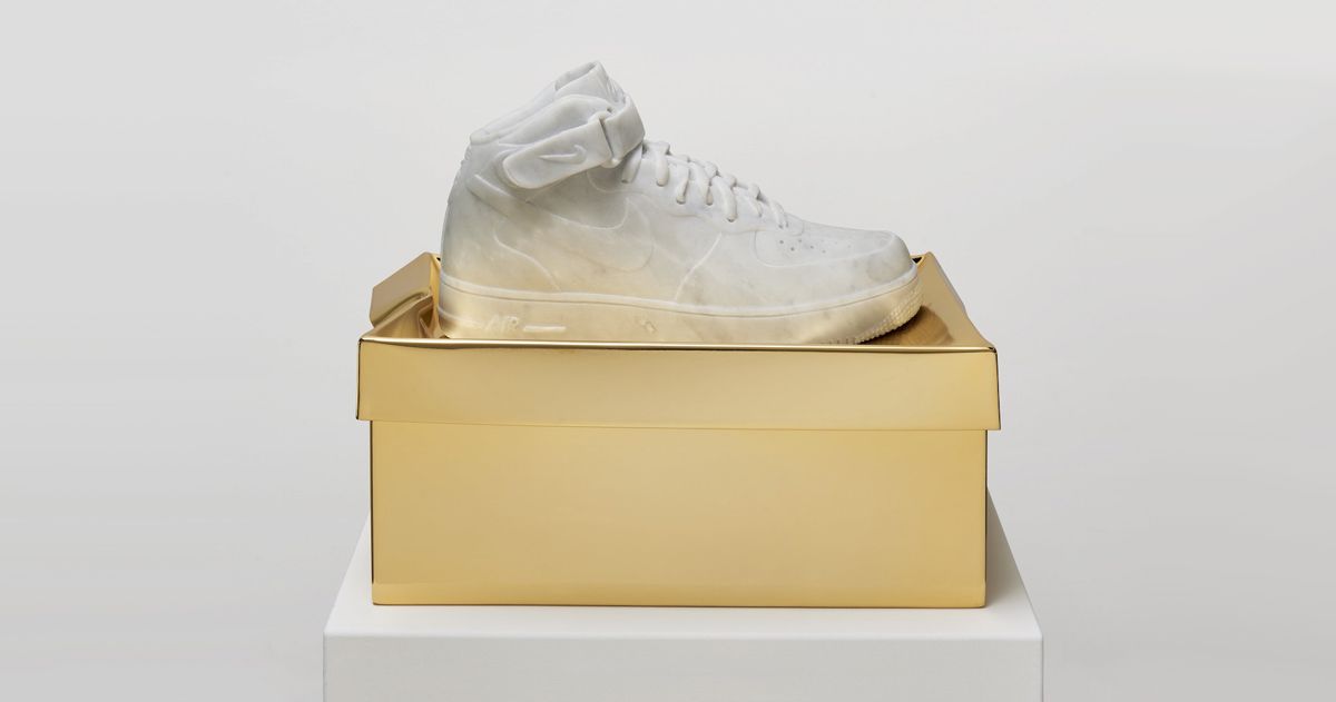 With marble as his main medium, the incredible artwork features the evergreen Nike Air Force 1 Mid silhouette with a golden shoe box, a body-less sculpture of Micky Mouse, stack of LEGO bricks (in a size that I won’t step on — ouch), a basketball hoop with a backboard, and a skateboard.