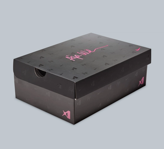 The shoe box abandons the pair's color palette in favor of a black-and-pink look with which the A'One launched.