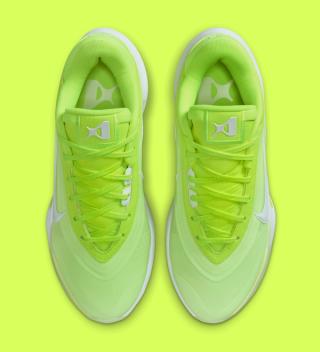 Where earlier colorways leaned into balance and versatility, the “Volt” edition flips the script entirely. Saturated neon green floods the upper, giving the shoe an unmistakable presence that reads instantly from the baseline to the nosebleeds. The translucent textile construction allows subtle layering and tonal depth to show through, keeping the color bold without flattening the design. A crisp white Swoosh runs along the lateral side, providing sharp contrast while anchoring the look in classic Nike Basketball language.