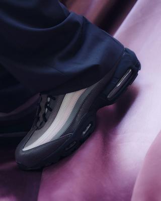 The Air Max 95 design features a dynamic play of textures and shades that encapsulate the essence of nighttime toil. Mauve accents pierce through the darkness of the sleek black midsole, symbolizing the sparks of inspiration that often strike under the cover of night. Reflective 3M detailing on the heel and tongue adds a practical element that nods to late-night visibility while also metaphorically highlighting the often unseen efforts that contribute to success.