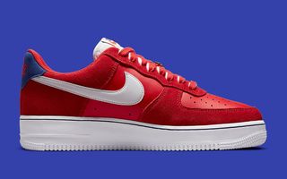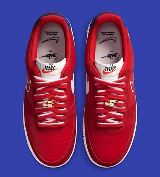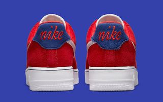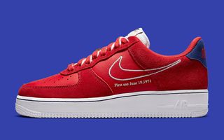 Just like the pack’s Blazer Mid, the Air Force 1 identifies June 18th, 1971 as the trademarked date, embroidered into the lower lateral size below the outlined Swoosh — also embroidered. These two embellishments join vintage cursive Nike branding in the rear and solid white leather Swooshes on the instep. Outsoles and tongues follow suit in hue, with everything else arriving in red leather and suede. Capping off the design is contrast blue stitching along the midsole, a dual lace set n white and red, retro logo-branded insoles, and special lace bling — a golden Swoosh mounted with a solitary diamond.