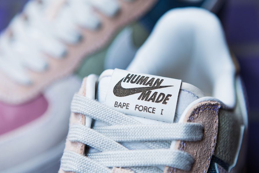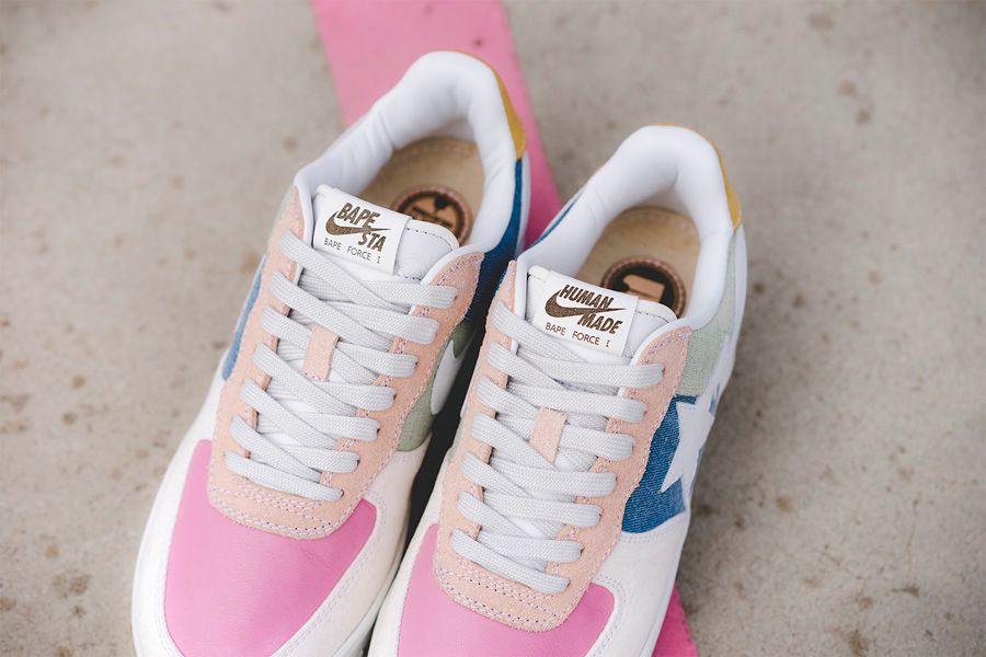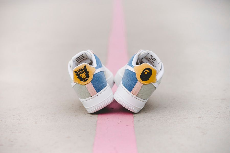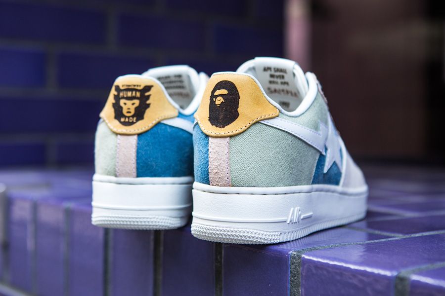 Encased in a selection of the most supple & buttery pastel calf suedes, kangaroo nu-buck, vege-tan cow, tumbled calf, lamb skins & vintage canvas textiles & Oyama hand-distressed denim, BespokeIND have created this “Human Made” Bapesta x Nike Air Force 1 — by hand, of course