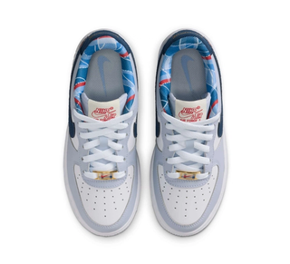 Fabric panels appear throughout the sneakers, replacing traditional leather construction. Nike text on both the tongue label and Achilles' heel takes on non-standard styling, with the latter element's branding resembling classic varsity jacket lettering. Inner lining is animated by a blue-and-red plaid pattern, which also appears on the Air Force 1's golden lace dubrae. The aforementioned mascot is reminiscent of a kangaroo and appears with Just Do It messaging.