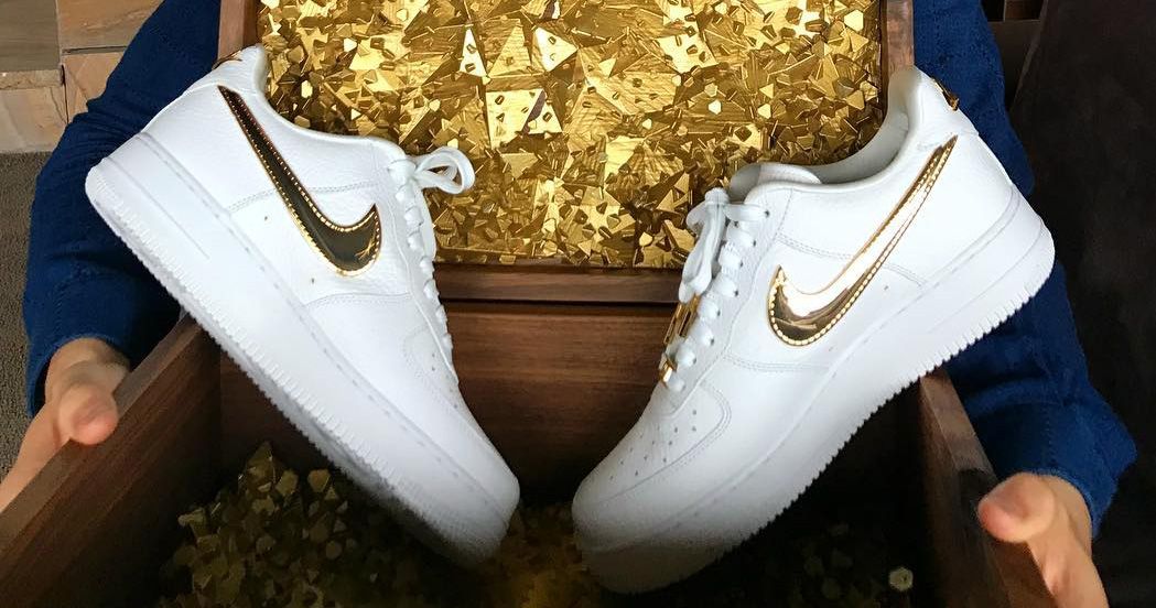 The celebratory gift is a staple pair of white AF1 Lows with aded 24k gold Swooshes, heel counter and gleaming lace jewels. Designed by Nike’s Ben Kirschner, the pair was presented in a special box also riddled in gold.