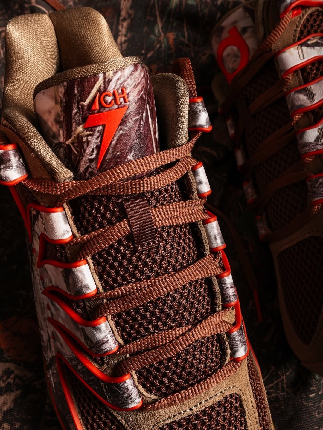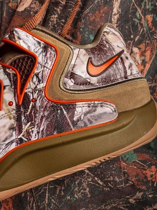 Chet Holmgren’s Nike KD 18 "Coyote" leans into rugged, outdoors-inspired aesthetics. The upper is wrapped in woodland camo panels, layered with brown mesh and suede overlays that reinforce the earthy palette. Vibrant orange piping traces the molded midfoot cage and Swoosh branding, adding sharp contrast while subtly nodding to OKC’s team tones. The mix of textures gives the shoe depth without overpowering the performance-driven build.