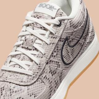 The upper of the Book 1 features a light brown colorway with a textured finish that resembles the intricate patterns found on a python skin. This design choice gives the sneaker a unique and exotic appearance, setting it apart from other releases.