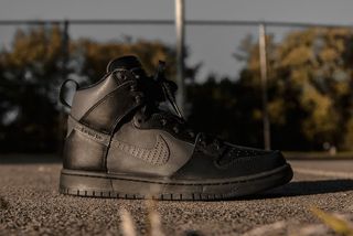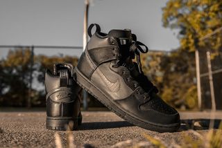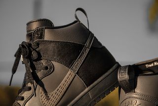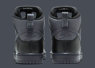 The original artwork that is a Triple-black Dunk has been modified — by approximately 40% it seems — featuring a retooling of the tongue and Swoosh that pay homage to the neighboring Jordan Brand. The tongue is ripped straight from the Air Jordan 6, with Nike SB taking place of the original Jumpman on the mini shroud overlay and substituting the protruding “AIR JORDAN” text with “NIKESB” above the tongue’s windows The Swoosh arrives in like-netting to the Air Jordan 5, completing the callouts to the Jumpman brand. Other tweaks include FPAR/Swoosh logos on the heels, “Don’t Follow Me” and “Trust No One” inscribed on the rear of the Swoosh and tongue liner respectively, and a FPAR-banded heel pull. This collab will also be housed in a custom shoebox built with transparent materials.