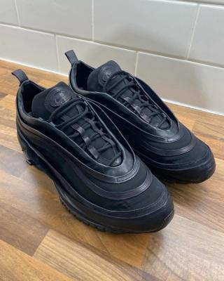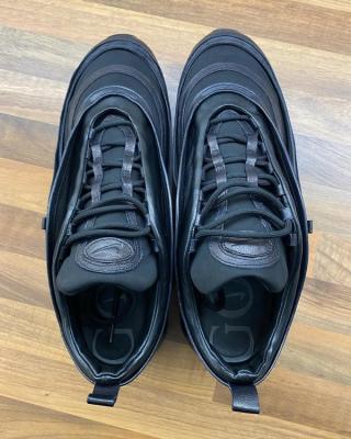 At first glance, the GOYAGOMA x Nike Air Max 97 appears almost entirely monochrome. The sample pairs shown lean heavily into blacked-out finishes, with layered leather mudguards replacing the traditional reflective ripples that typically define the silhouette. Mesh underlays remain, but the overall execution feels denser and more sculpted — less sport, more statement.