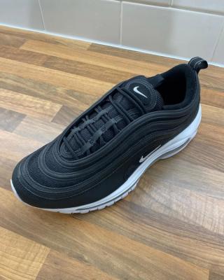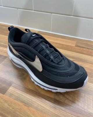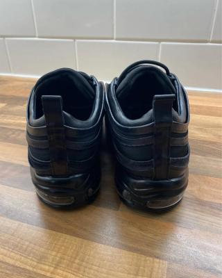 The design walks a fine line between minimal and maximal. From a distance, it reads clean and uniform. Up close, the detailing tells a different story: stacked panels, textured leather overlays, thickened piping, and extended pull tabs that give the heel a more utilitarian presence. The Air midsole stays true to the 97’s DNA, though even here the all-black execution sharpens the model’s profile.