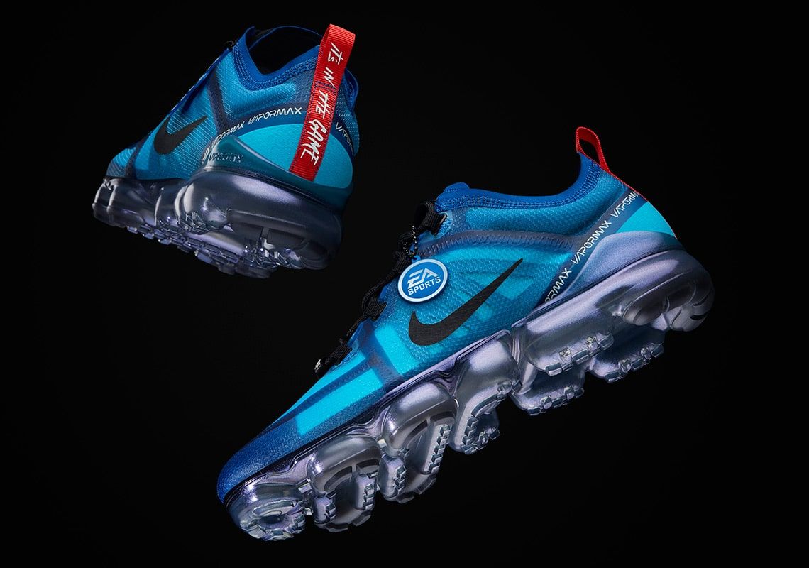 The shoe rocks a Blue translucent upper, tonal inner cage, along with Black accents on the Swoosh and laces. A Red heel tab emblazoned with EA Sports’ signature tag line, “It’s in the game,” and a Madden NFL 19 logo across the bottom laces. Capping off the design: an EA Sports hang tag.