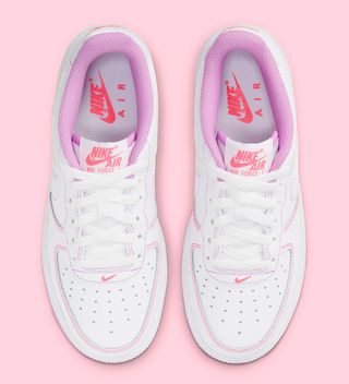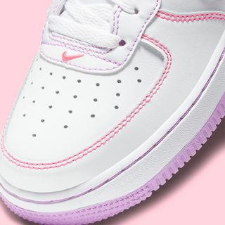 Arriving in the same vein as the adult’s “Contrast Stitch” collection, the pair features colores liners, and outsoles, with ALL stitchwork throughout dyed in hue. This pair differed from those as it’s not a monochrome stitch finish, instead opting for various color threadwork throughout. A bright lilac is leveraged the most, hitting the liners and outsoles, as well as the colorful threadwork along the Swoosh, eyelet, and rear overlays. Pink pops at the toe overlay, and also hit the forefoot, tongue, and rear branding, while quarters are tacked on with a soft yellow stitch.
