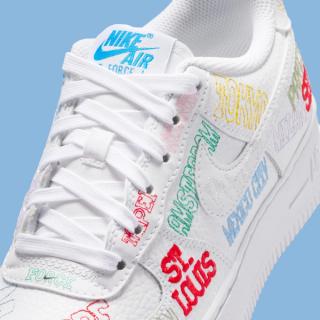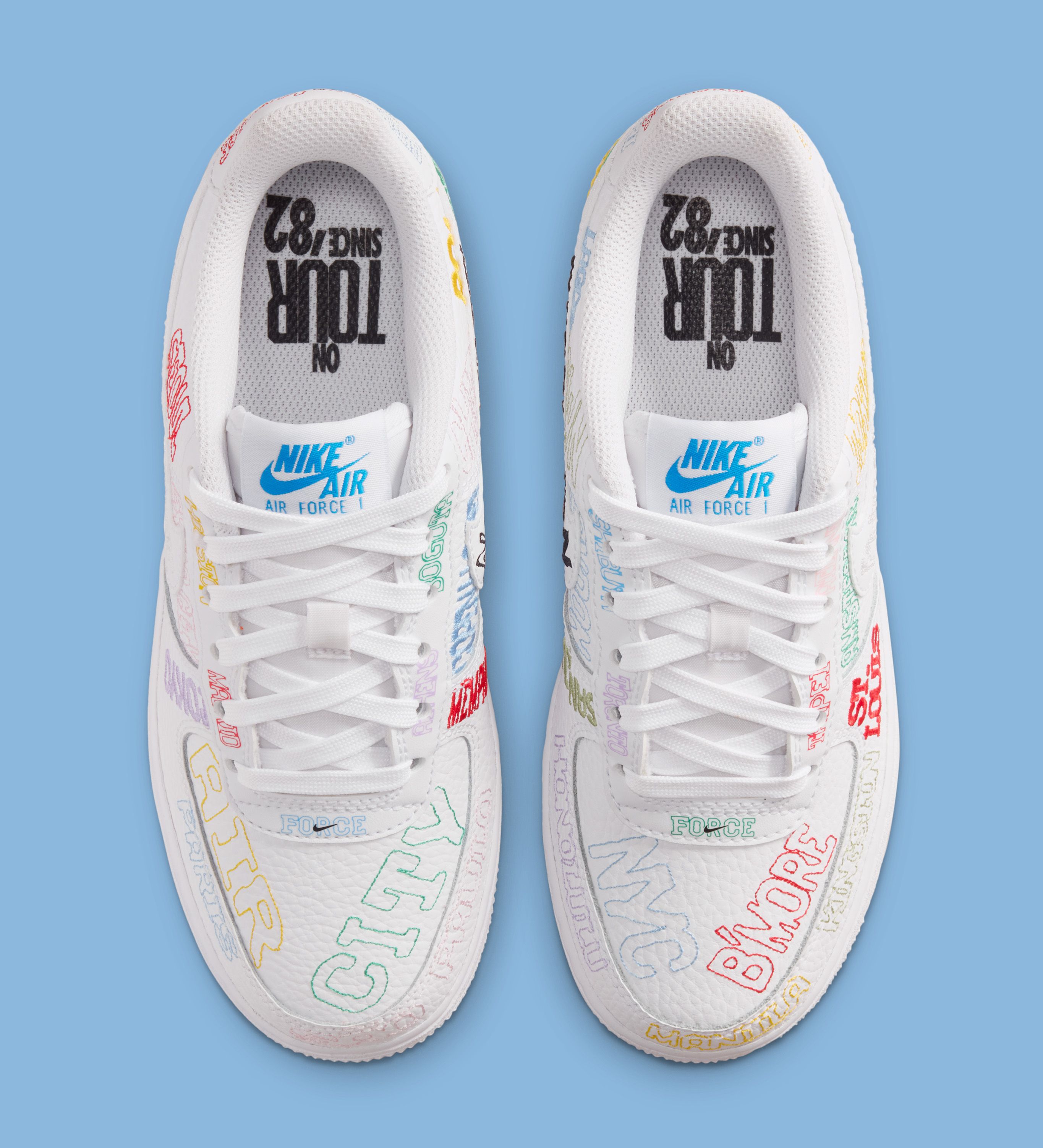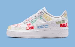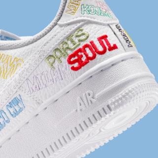 Each location is stitched in distinct type treatments and colors, giving the pair a scrapbook-like energy without overwhelming the classic AF-1 framework. Standard Nike Air branding appears on the tongue in bright blue, while the traditional white sole unit keeps things clean and wearable.