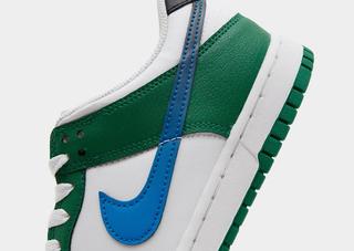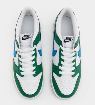 However, what truly distinguishes this Dunk Low is the innovative Swoosh. Nike departs from its classic design, presenting a gradient that begins with a bright photo blue at the tip and seamlessly transitions into the thematic pine green towards the heel. This spectrum is not just a color choice; it's a visual representation of imagination and endless possibility, attributes that resonate with the vibrancy of youth.