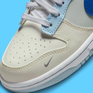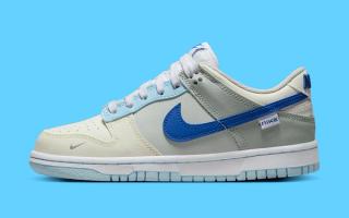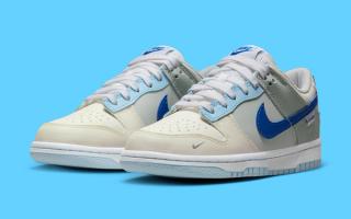 Dressed in shades of grey, blue, and beige, the pair presents each panel with its own unique hue. Working backward from the toe, you’ll find sail boxes and creamy beige caps, with mid panels of grey overlayed by sky blue eyestays. From there, mid-grey quarter panels overlay bone heels, while striking royal blues paint the profile Swooshes. That hue is matched at the tongue and heel branding — the latter delivered in 3D embroidery. Extra embellishments are plentiful, including jersey mesh tongues, added forefoot Mini Swooshes, and lateral ankle tags, too. The pair is then finished by a simple white and light blue sole unit, complete with contrast stitching.