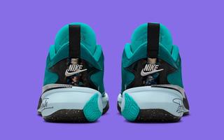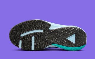 The midsoles of the Zoom Freak 5 take on a Glacier Blue hue, continuing the ice-cold theme observed in the collection's Nike JA 1. This cool, crisp color is juxtaposed against the bold black accents at the heel, half-Swoosh, and rubber outsole. The black outsole is not just any ordinary finish; it boasts a glittery speckle, adding an extra layer of flair and making the shoe a true standout piece.