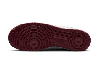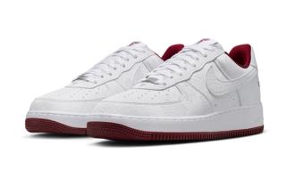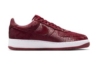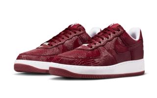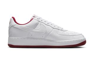 The pack includes two Nike Air Force 1 Low colorways inspired by the school’s team palette. One arrives in a rich maroon finish with textured uppers that resemble reptile skin, paired with tonal Swoosh branding and a crisp white midsole. The second pair flips the look, opting for a clean white upper with maroon accents on the collar and outsole.