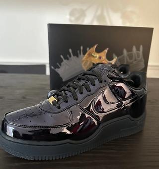 No party involved has confirmed specific details about the project as of yet, but it's probable the "Black" patent leather-covered style will launch over the next year as part of James' Forever King Collection, which commemorates the athlete's history-making 23rd NBA season and milestone signature model. The AF-1 includes a similar crown-shaped mold along the profiles to the aforementioned Nike LeBron design and replaces certain mentions to Air with LBJ messaging.