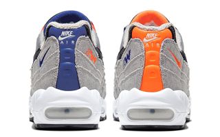 The 90 arrives black-based, it’s upper in a black/white marle, along with jet black lacestays liners, branding hits, and sole units. The only pops of color come from the mismatched purple and pink tongue tags, and the pair comes complete with co-branded insoles and carry bag. We’ve only got a teaser image of the 95, but it shows a lighter, brighter, blur and orange-capped pair, which arrives predominately in grey fleece. Lace loops match that of the 90’s tongue tags, and it arrives on an all-white sole unit along with co-branded heels.